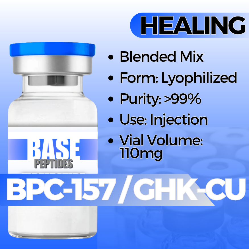 - Supports wound healing and tissue regeneration by combining GHK-cu’s skin-repair properties with BPC-157’s tissue-healing capabilities.